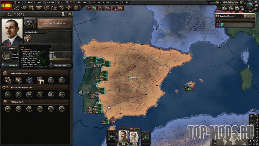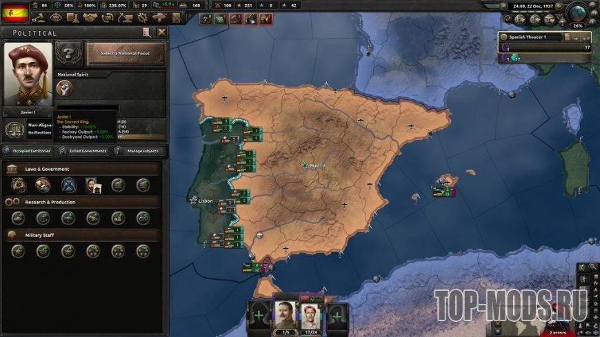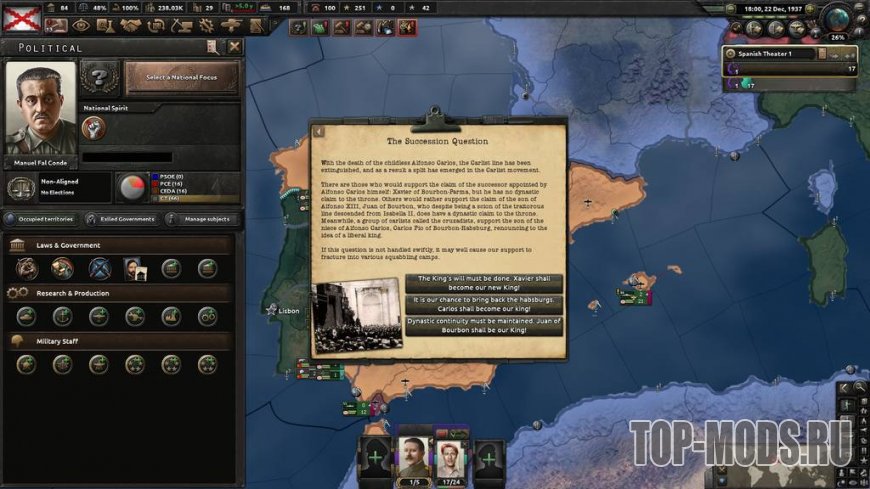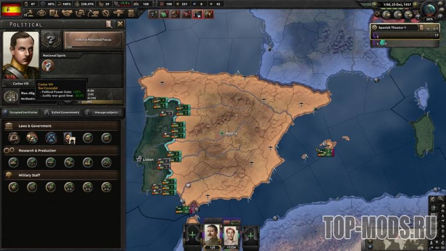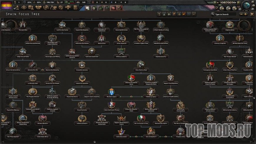 Этот мод добавляет и перерабатывает 3 ветви дерева Карлистов: улучшенную армейскую ветвь, восстановительную / промышленную ветвь и гораздо более интересный путь расширения! Кроме того, он добавляет 2 новых возможных короля (один из них Габсбург!), 3 новых генерала для карлистской Испании, 3 новых политических советника (по 1 для каждого короля), а также некоторые военно-морские, воздушные и т. д. советники, так что вы можете иметь всех советников, которых хотите!