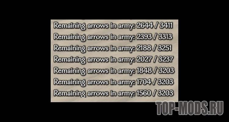 Мод "Army Arrow Counter" позволяет отслеживать, сколько стрел/болтов/снарядов в целом осталось у вашей команды. Это особо полезно во время осад и защиты, или же затяжных драк. Показывает только количество снарядов ваших воинов, так что снаряды союзных лордов не учитываются.