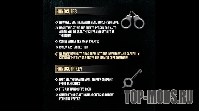 - Добавлены усиленные наручники, которые невозможно сломать. | Изготавливаются из обычных наручников на изготовителе.