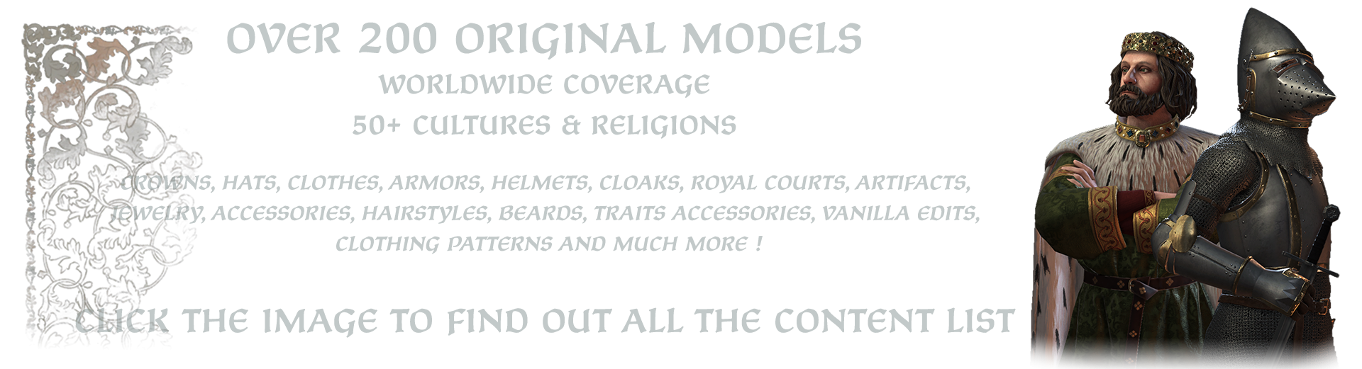 Community Flavor Pack — это набор, который добавляет множество исторических портретных аксессуаров для ваших персонажей. Он восполняет многие культурные пробелы в стандартной версии CK III.