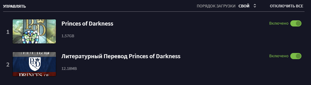 При выборе порядка загрузки модов в лаунчере, сначала ставим основной мод Princes of Darkness, а ниже него русификатор Princes of Darkness.