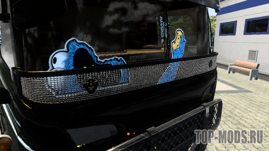 Этот мод добавляет наклейку (Cookie Monster) на переднее стекло и дворник для грузовиков RJL Scania R & Streamline v21.12.9.