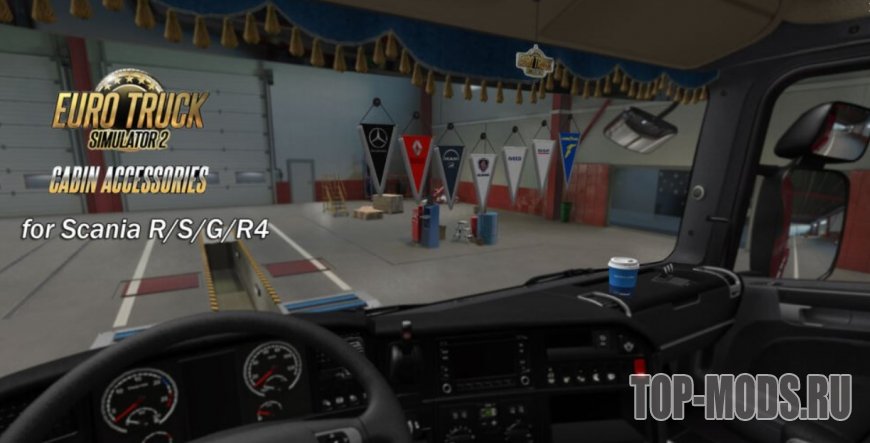 Дополнительное оборудование кабины для Scania R / S / G / R4. Этот мод поддерживает новую версию DLC Cabin Accessory для грузовика Scania R & Streamline Modifications от RJL.