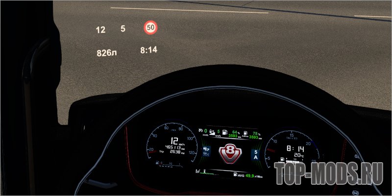 Добавляет на лобовое стекло виртуальную проекцию с информацией: текущая скорость, круиз-контроль, ограничение скорости, передачи, игровое время, информация о топливе. Мод прописан как необязательный. Можно использовать в конвоях.(не путать с TMP). Есть небольшой баг - в дождь проекция "размывается".