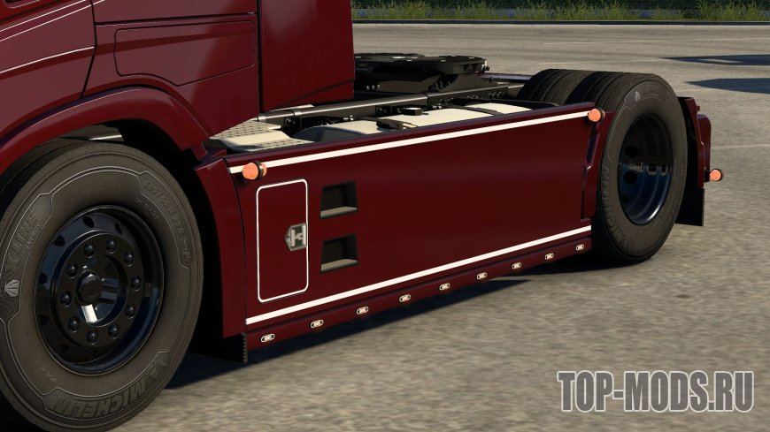 - Все детали боковых юбок изготовлены с нуля, за исключением ручки рундука, которая позаимствована у SCS trailers.