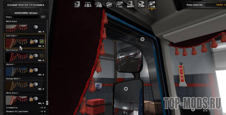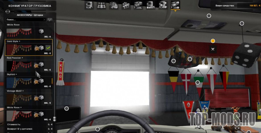 Небольшое дополнение к DLС «Аксессуары для салона», которое расширяет ассортимент штор, которые уже есть в игре. Добавлены анимированные шторы на боковых окнах. Поскольку дополнительные шторы являются дополнением к уже существующим, текстуры и цвета выполнены в соответствии с оригиналом.