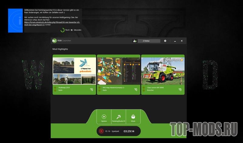 Что такое FarmingLauncher19? FarmingLauncher19 - это средство запуска для Farming Simulator 19, оно предлагает вам множество опций, таких как запрос новых модов или управление папкой модов.