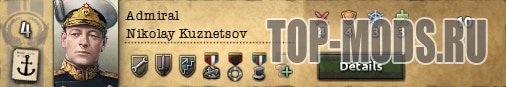 Адмирал Кузнецов теперь доступен для вашего флота. Портрет взят из игры World of Warships, с аналогичной статистикой навыков.