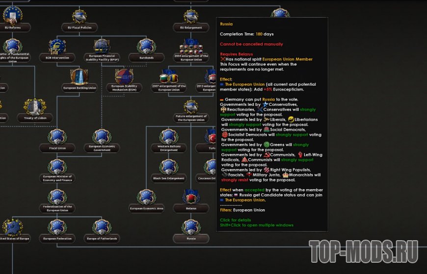 Мы с другими игроками заметили, что вы не можете вступить в ЕС как Россия, даже если завершите Путь Явлинского. ЕС также не может пригласить вас в качестве России, поскольку у них нет для этого Фокуса.