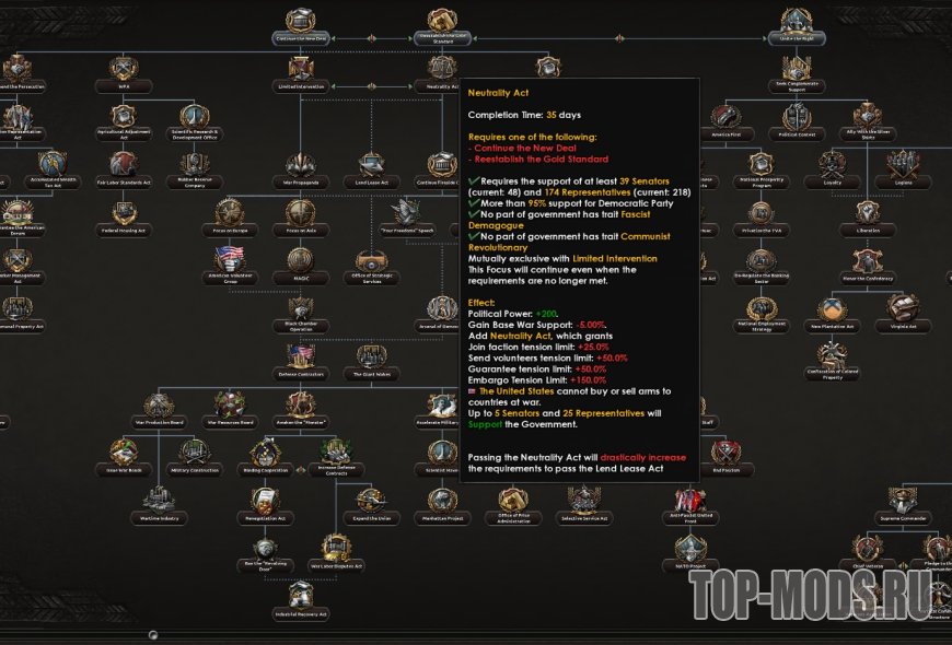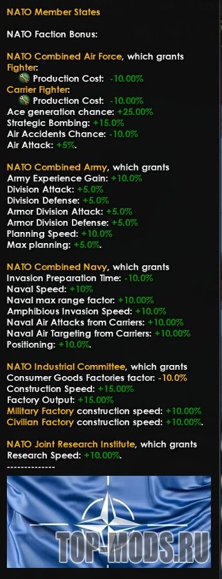 Соединённые Штаты, будучи главной опорой во Второй мировой войне, оказали огромную поддержку объединённому антифашистскому фронту. Однако из-за устаревшего дополнения Paradox США оказались статистически ослаблены и превратились в борющуюся за выживание страну. Этот мод призван исправить эту ситуацию. Текущий прогресс: