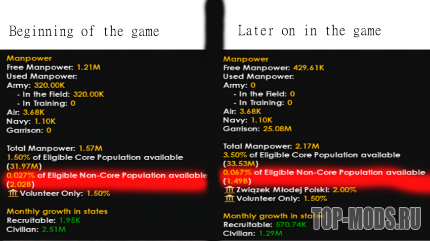 Сокращение численности населения в условиях оккупации означает, что установление ваших законов о принудительном труде, жестких квотах и жестоком угнетении приведет к тому, что оккупированные штаты потеряют свое население. Это может положить конец большому движению сопротивления, но ограничивает рабочую силу, ресурсы и особенно рабочих для фабрик. По сути, этот мод предназначен для тех случаев, когда у вас много сопротивления и много гарнизонов, и вы просто не хотите, чтобы страна больше сопротивлялась, вы можете убивать и уничтожать население всего несколькими военными преступлениями.