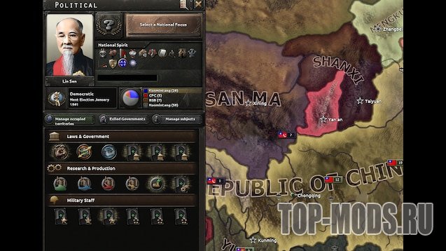 Совершенно новое дерево фокусов для ванильного Китая. Этот мод предоставляет вам больше возможностей для управления националистическим Китаем, включая решение проблемы гражданской войны между коммунистами, подавление полевых командиров и взаимодействие с японцами. Совместим со всеми дополнениями и большинством других модов.