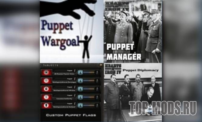 Сочетает в себе лучшее из следующих модов: Puppet Wargoal, Puppet Manager, Puppet Diplomacy 1.10 - DISCONTINUED и Custom Puppet Flags ради совместимости и поскольку они больше не выпускаются. Таким образом, этот мод несовместим со следующими модами.
