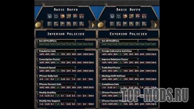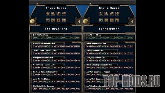 Этот мод имеет пикантное меню баффов/дебаффов с множеством опций на выбор. От месячной численности населения до коэффициентов опыта. От недельной стабильности до шанса генерации асов. Теперь у вашей игры есть ВАШИ правила.