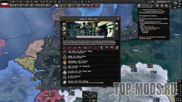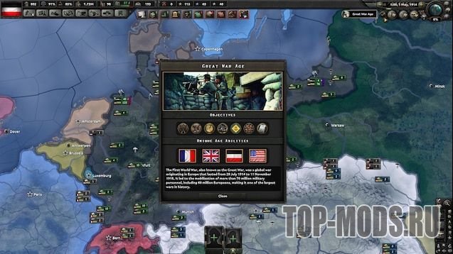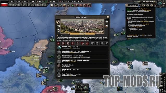 Этот мод добавляет 6 эпох (3/4 для ванильной временной линии (одна из них очень поздняя и может работать с несколькими модами на холодную войну или современность), 2 для временной линии Hearts of Iron IV: The Great War).