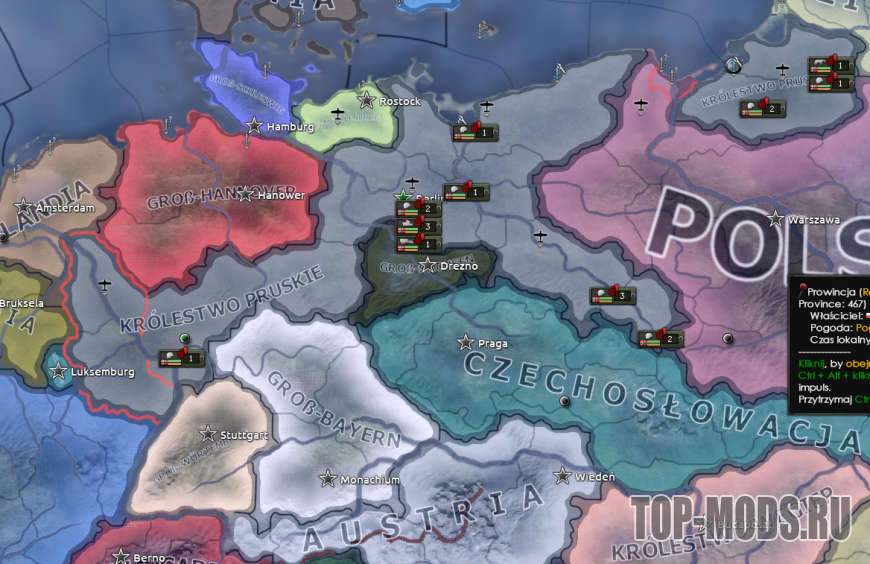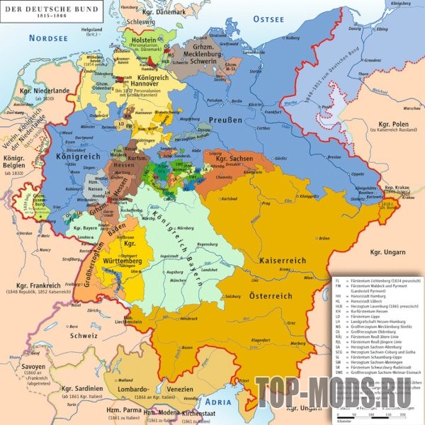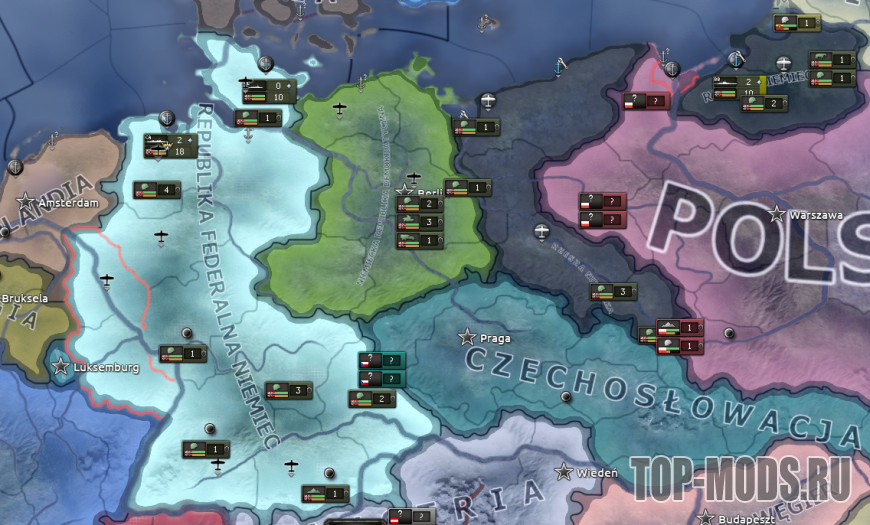 Этот мод просто добавляет ядра для основных немецких стран, которые существовали до объединения в 1871 году, а также ядра западных и восточных послевоенных республик Германии, чтобы можно было освобождать или "марионетать" эти страны во время мирных конференций!