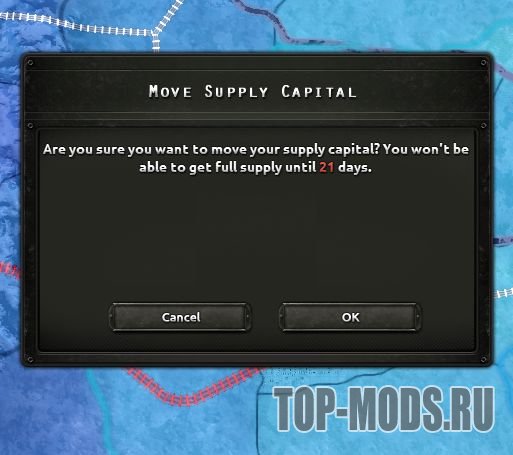 Ваш столичный узел снабжения теперь перемещается! В течение 7 дней у вас не будет снабжения с железных дорог, после чего снабжение будет постепенно увеличиваться еще 14 дней, пока вы снова не получите полное снабжение. (Поведение HOI4 по умолчанию)
