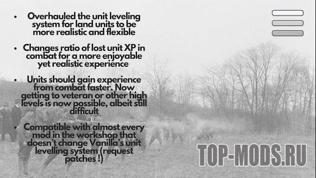 Не совместим ни с одним модом, изменяющим систему уровней юнитов. R56 пока не поддерживается