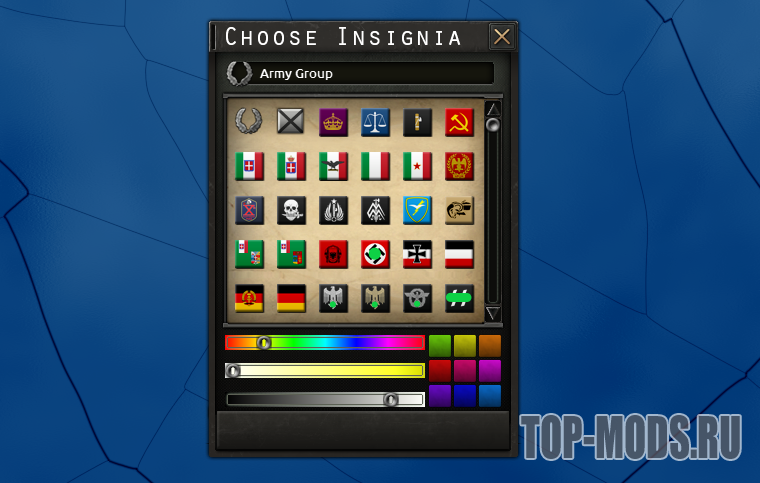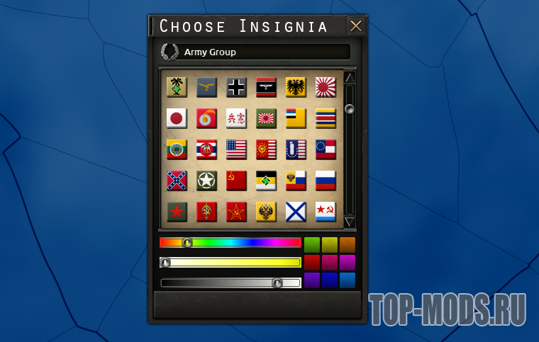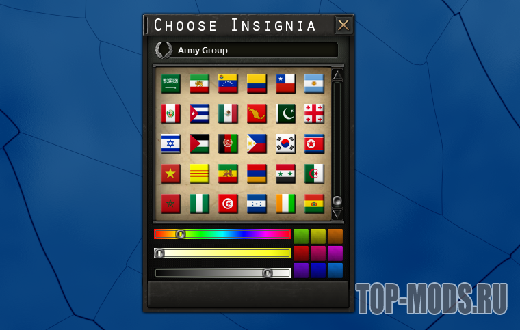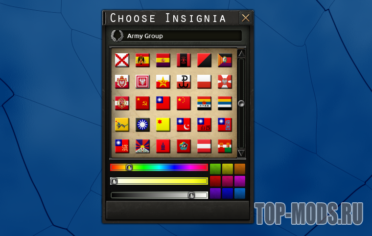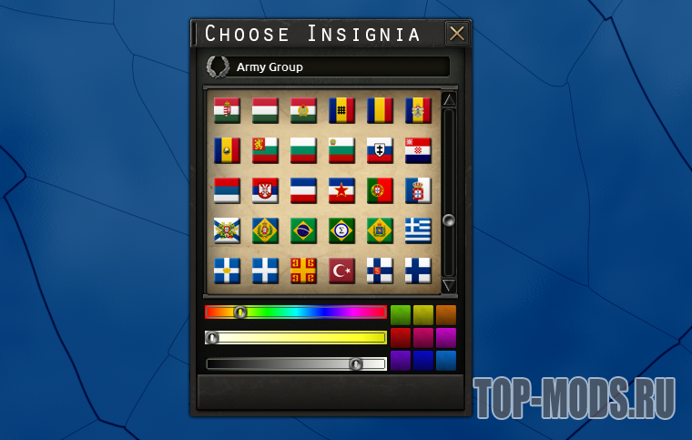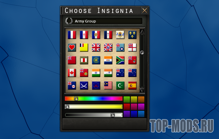 Этот мод добавляет в общей сложности 204 значка армии и группы армий, которые можно использовать как любую нацию, большинство из них - флаги, но есть и другие символы.