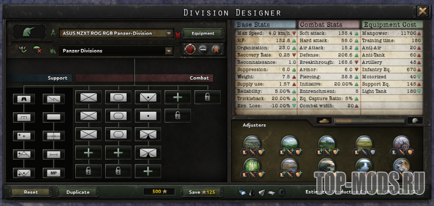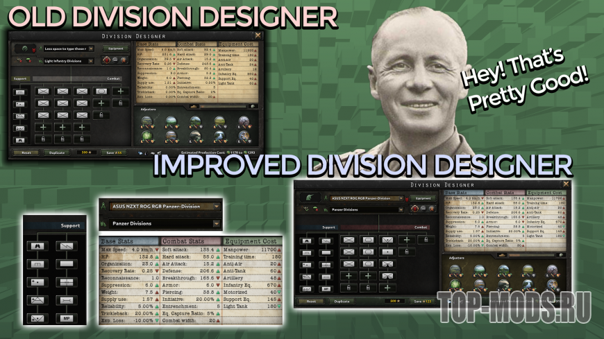 Но, к сожалению, он давно не обновлялся и несовместим с современной HOI4. Поэтому я решил взять на себя ответственность за его обновление до современной версии HOI4. Друзья, представляю вам: Better Mechanics: Division Designer.