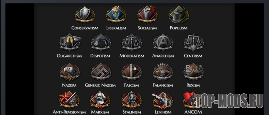 Значки были созданы на основе описания, данного каждой подидеологии в игре.