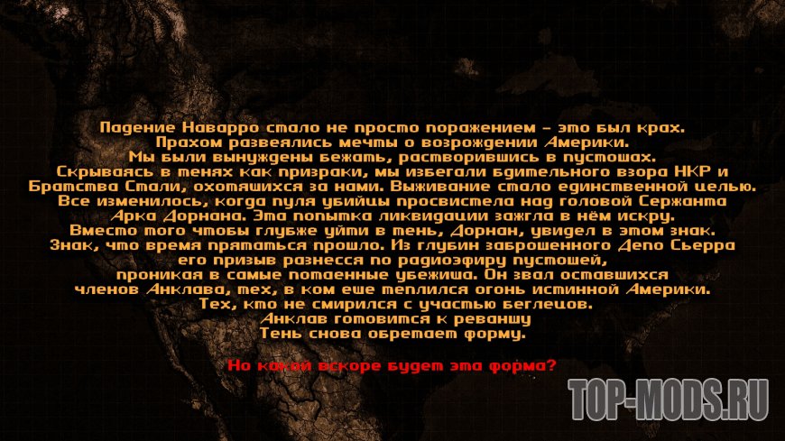 Русская локализация для мода Enclave Reborn Redux. В первой версии присутствуют ошибки перевода. Перевод выполнен вручную одним человеком.