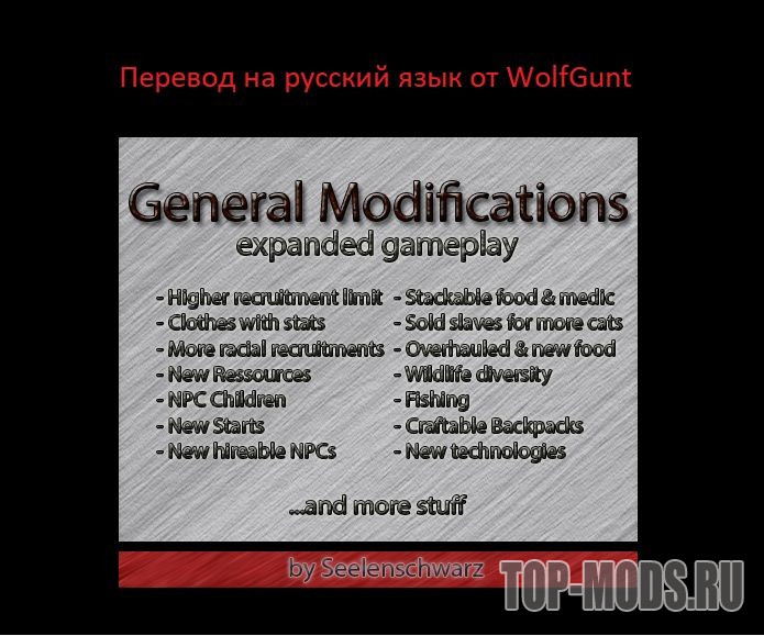 Данный мод является переводом мода General Modifications. Сам оригинальный файл с модом качать не надо, качаете этот, распаковываете в папку kenshi/mods/ и активируете в лаунчере. Мод добавляет очень много нового и состоит из различных модов, т.е это почти сборка.