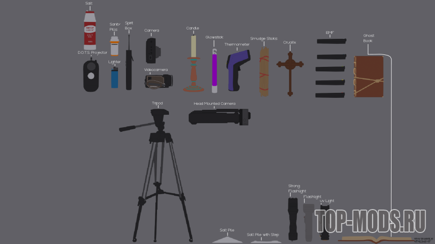 Мод, основанный на игре Phasmophobia, добавляет много снаряжения для охоты на призраков и для других целей...