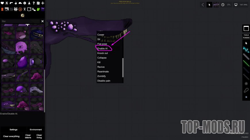 Некоторые существа обладают особыми способностями, а у крупных левиафанов есть искусственный интеллект, который можно переключать, и они будут выслеживать людей и сражаться друг с другом. ИИ очень легко не заметить: щелкните правой кнопкой мыши на голове существа и выберите пункт "Включить ИИ", и оно начнет летать вокруг вас, как огромная змея.