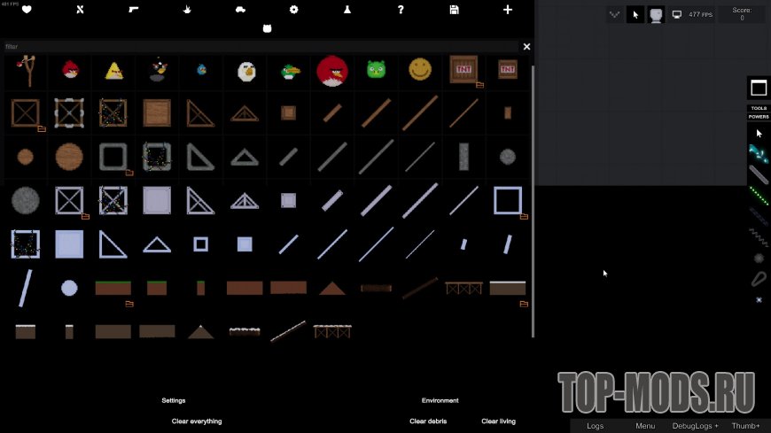 Мод добавляет огромное количество различных вещей из Angry Birds. Множество объектов для создания уровней, птиц и их способностей, свинью и пользовательские уровни (при выборе карты). Структуры можно сохранять и использовать для создания из них "уровней".