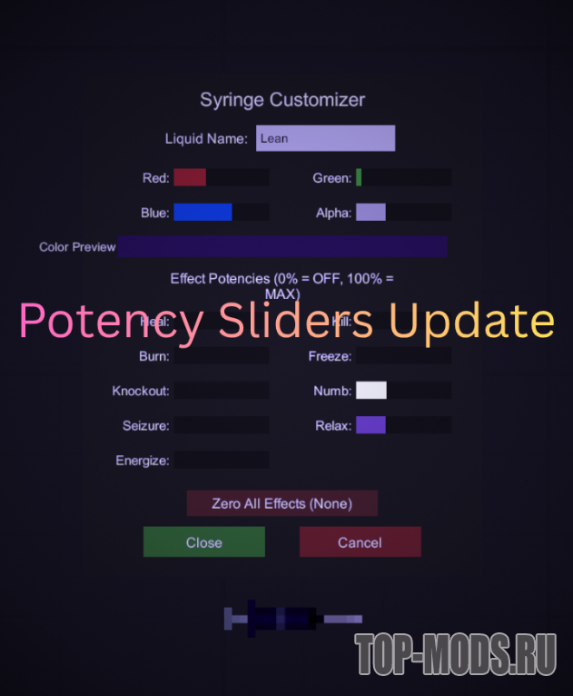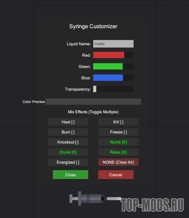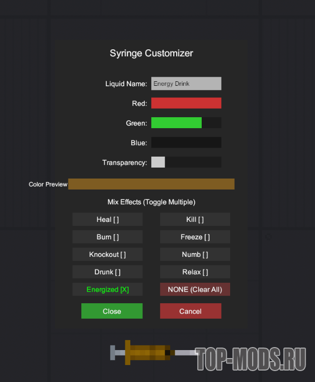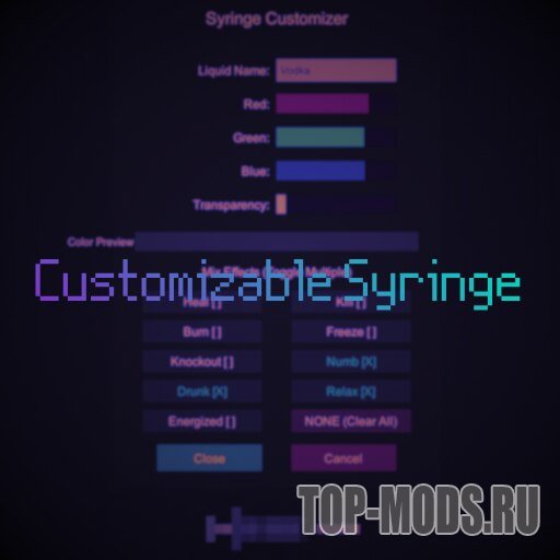 Добавляет шприц. ПКМ для изменения цвета, названия и выбора эффекта.