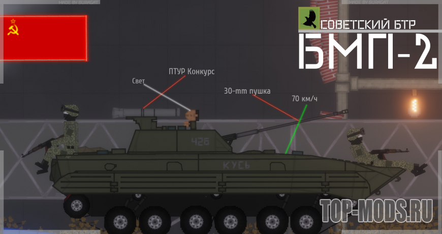 БМП-2К — советская гусеничная боевая машина пехоты, предназначенная для транспортировки личного состава к переднему краю, повышения его мобильности, вооружённости и защищённости на поле боя. Представленная в этом посте модификация БМП-2 - БМП-2К имеет ПТУР "Конкурс" и опознавательный знак надпись "Кусь" принадлежит экипажу 39-ой ОМБР участвовавшей в Афганистанском конфликте.