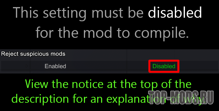 Модификация не работает в бета-версии 1.26. Вы должны отключить параметр «ОТКЛОНИТЬ ПОДОЗРИТЕЛЬНЫЕ МОДЫ» в общих настройках.