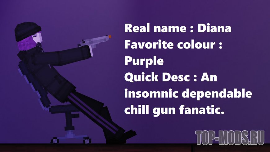 Ее прозвали Азалией за одержимость фиолетовым цветом, ее первое имя - Диана. Она - холодный, страдающий бессонницей фанатик оружия, который с юных лет решил пойти на охоту со своим отцом, позже она получила легальное охотничье ружье в возрасте 17 лет, что еще больше подогрело ее оружейные фантазии, так как она получила лицензию на оружие и купила свой собственный крисс-вектор в возрасте 21 года, позже она подала заявление, чтобы стать офицером полиции, но ей было отказано из-за ее психической непригодности, Она обычно проводит свое время дома, всегда в тусклом фиолетовом освещении, и имеет хорошие связи с друзьями в Интернете. С ней весело общаться.