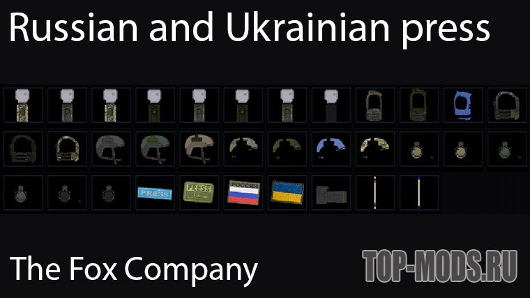 Сотрудники прессы, шлема, чехлы на шлема, шевроны, бронежилеты, активные наушники, камера, удостоверения журналистов.