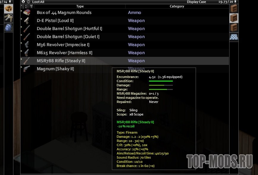 Такие действия, как складывание/раскладывание приклада или изменение типа магазина, на самом деле являются рецептом создания нового оружия, поэтому он меняет модификатор оружия. Чтобы избежать этого: оставьте настройку песочницы «Множитель шанса на созданное оружие дальнего боя» на 0, чтобы модификатор полностью терялся, а не перебрасывался.