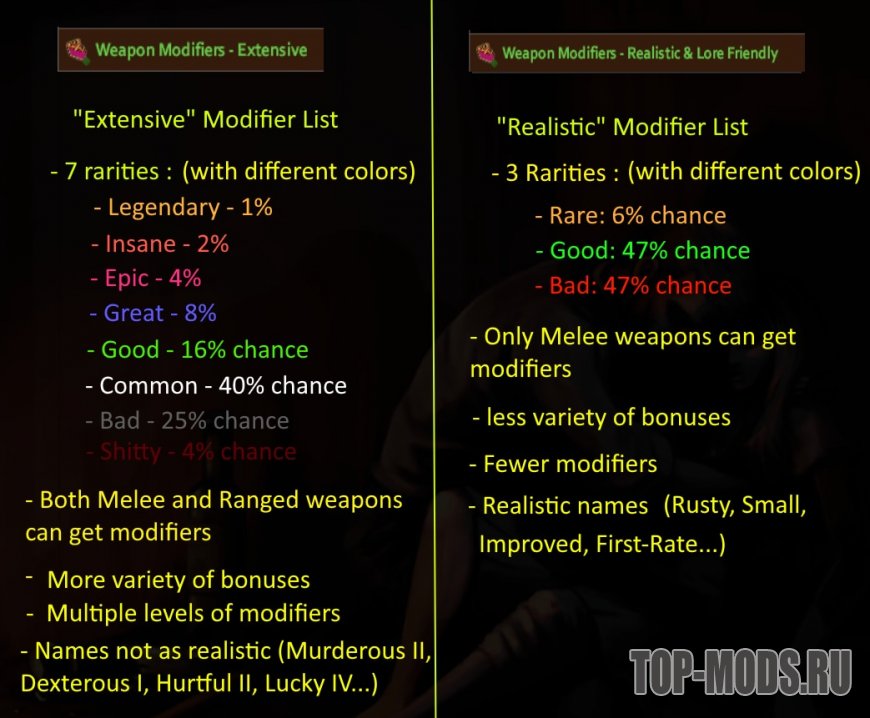Этот мод добавляет модификаторы оружия, которые дают оружию бонусные (или минусовые) характеристики.