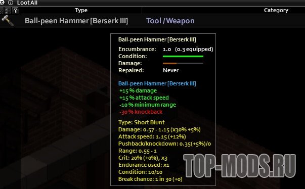 Вам нужно будет включить мод «Framework» И выбрать один из двух других модов «Extensive Modifier List» или «Realistic Modifier List». Затем, если вы хотите, вы также можете включить дополнительный мод «Tinkering Skill (Reforge)», который добавляет навык Мастерства и действие смастерить, которое позволяет игроку перековать модификатор оружия.