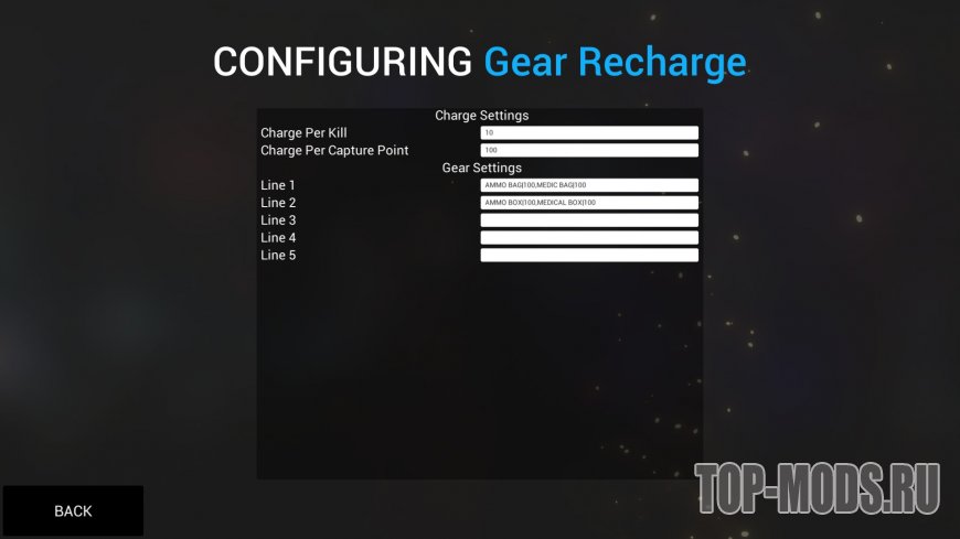 Формат конфигураций следующий: WeaponName|RechargeRequirement|GearType|GrowthMultiplier.