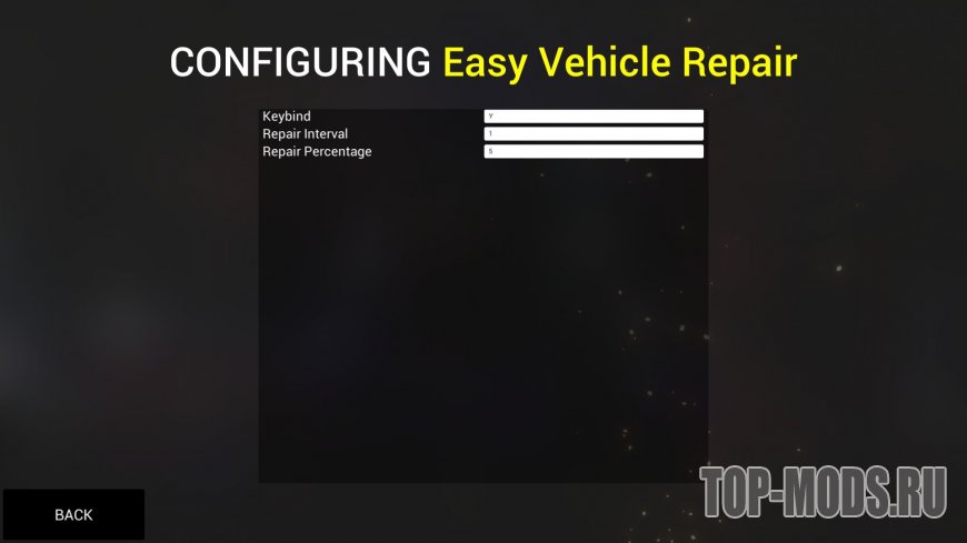В настройках мутатора можно изменить интервал ремонта, процент ремонта и привязки клавиш.