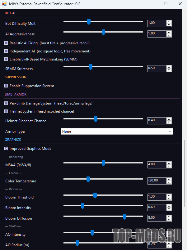 Модификация представляет собой плагин для BepInEx, требующий ручной установки и несовместимый с любыми модами, заменяющими файл Assembly-CSharp.dll. Для корректной работы необходим ванильный код игры (несовместима с PAIO+ и HavenM). Плагин объединяет функции множества мутаторов в единый интерфейс настроек, совместим с другими дополнениями на базе BepInEx (например, Dynamic Audio, Person’s Camera Improvements).