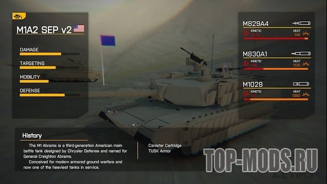M1 Abrams - американский основной боевой танк третьего поколения, разработанный компанией Chrysler Defense (ныне General Dynamics Land Systems). Задуманный для ведения современной бронированной наземной войны и в настоящее время являющийся одним из самых тяжелых танков на вооружении весом почти 68 коротких тонн (почти 62 метрические тонны), он внедрил ряд инновационных особенностей, включая многотопливный турбинный двигатель, сложную композитную броню Chobham, компьютерную систему управления огнем, раздельное хранение боеприпасов в продуваемом отделении и защиту от НБК для безопасности экипажа. Первые модели M1 были вооружены лицензионной 105-мм пушкой Royal Ordnance L7, в то время как более поздние варианты оснащались лицензионной 120-мм пушкой Rheinmetall L/44.