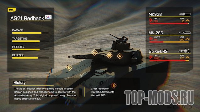 Боевая машина пехоты (БМП) AS21 Redback, которую планируется поставить на вооружение австралийской армии, разработана в Южной Корее в соответствии с требованиями Австралии к машине, заменяющей M113. Оригинальная конфигурация этой машины позволяет ей эффективно вести ближний бой, что отражается в высоком уровне защиты, мощном вооружении и отличной мобильности.