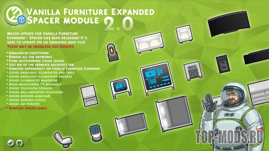 Vanilla Furniture Expanded — Spacer 2 — это масштабное обновление оригинального модуля Spacer, призванное перенести ваши колонии в конце игры в футуристическую эпоху с помощью мебели, которая действительно выглядит и ощущается футуристической. Это обновление модернизирует все визуальные элементы, балансирует игровые показатели и значительно расширяет контент. Оно по-прежнему добавляет то, к чему вы привыкли: элегантные кровати, мебель с подсветкой, интерактивные столы, огромные телевизоры, но теперь также добавляет очистители воздуха, современные диваны и кресла, настенные телевизоры и многое другое. Устаревшие или лишние элементы были удалены, и теперь всё полностью совместимо с текущими сохранениями. Независимо от того, стремитесь ли вы к комфорту, стилю или погружению, это обновление сделает ваши космические колонии соответствующими требованиям.