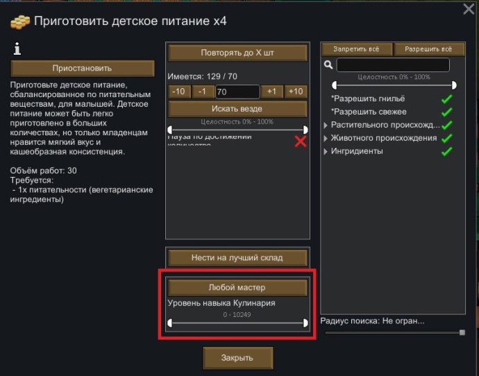 Я не понимаю что за слайдер подергать влево-вправо. Я добавил данный мод в уже готовую колонию. Так же по твоей рекомендации установил этот QualityBuilder и установил на 4 в настройках мода. Но ничего не поменялось. Колонисты, у которых навык кулинарии выше 20 — не могут готовить. пишет «для приготовления блюда требуется навык не больше 20 очков навыка»