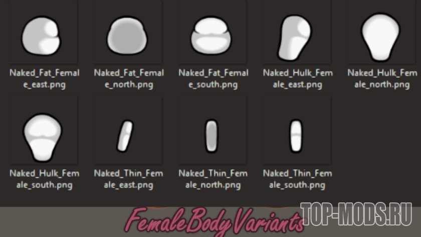 Этот мод предназначен для использования в сочетании с другими модами для ретекстура тела, в которых подготовлены текстуры / файлы, указанные ниже. Этот мод позволяет загружать на лету различные текстуры тела для худых, толстых и крупных женщин. В нем будут использоваться следующие названия: