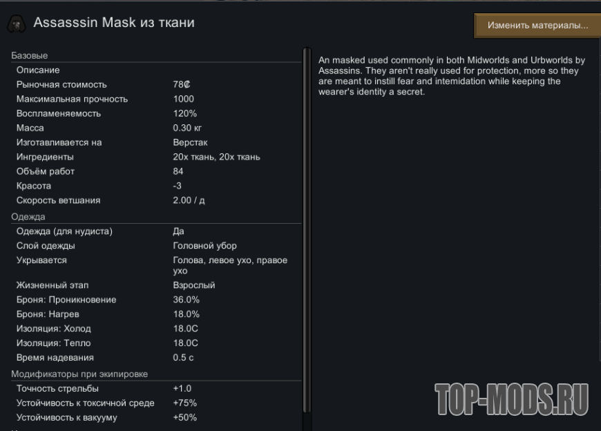 Мод "Dishonored Assassin Mask" для Rimworld добавляет маски, используемые группой убийц под названием «Китобои» из игры Dishonored. Сама маска не защищает вас от многого, хотя для рассказа историй вы всегда можете создать небольшую гильдию ассасинов.