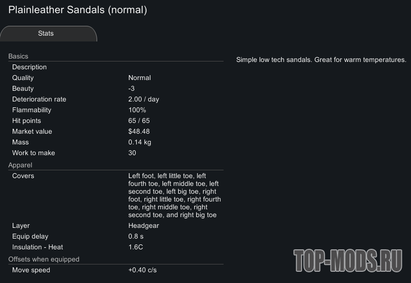 Сандалии: Сандалии практически не защитят вас от повреждений или холода, но они сделают вас быстрым и помогут в жарких биомах. (Неолит)