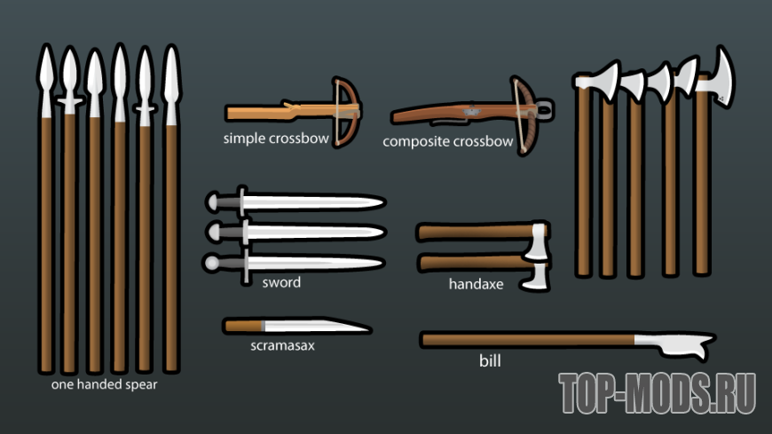 Оружие ближнего боя: одноручное копье, двуручный топор, двуручная секира, ручной топорик, боевой меч.
