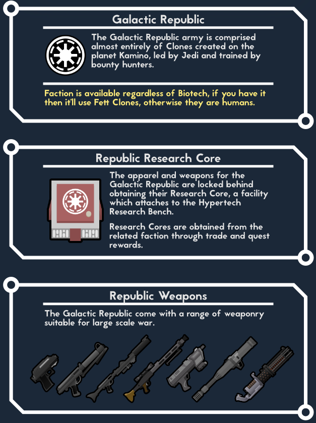 Этот модуль для серии модов Outer Rim охватывает все, что связано с Галактической Республикой. В основном это сама фракция и все необходимое для нее.